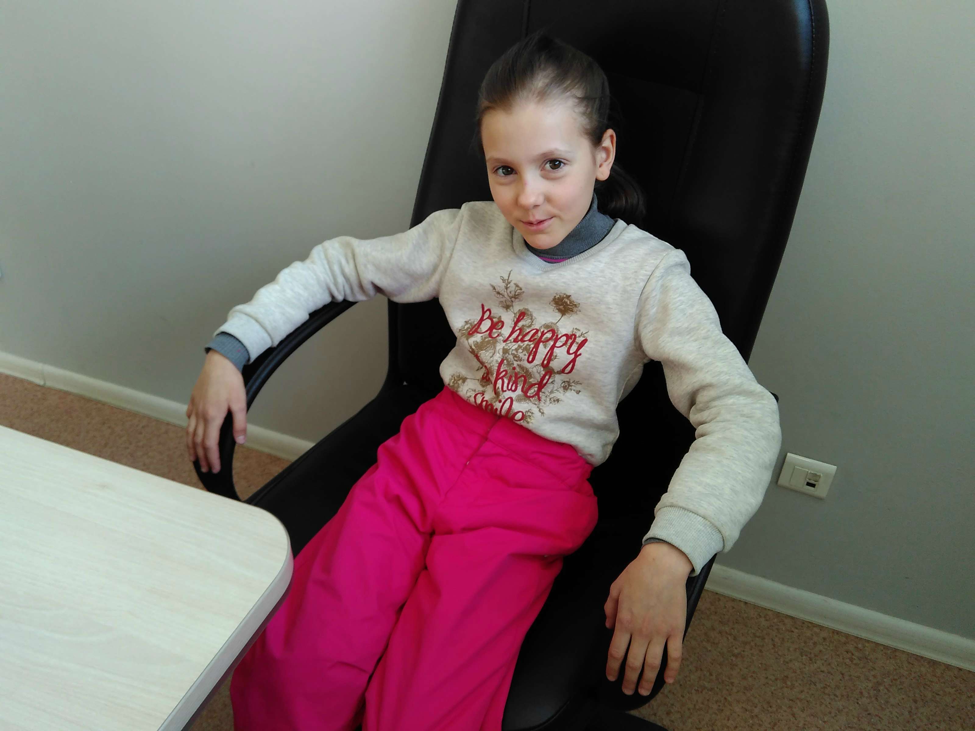 Улыбчивая, с весёлым озорным взглядом, красивая и спокойная девочка выглядит совершенно здоровой.